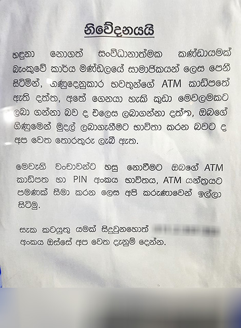Almost all banks have pasted a warning notice near the ATM booths . This warning notice to ATM users states that a group of people are visiting houses and claiming that they are bank assistants and enquire details of their bank accounts and ATM cards details including secret numbers. As they make use of these details and infiltrate into their bank accounts and draw money .