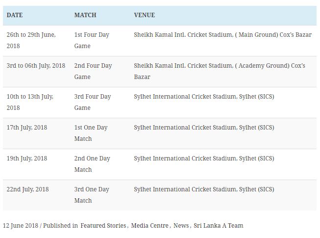 Hon. Minister of Sports Hon. Faiszer Musthapa PC has given his approval to the below Sri Lanka ‘A’ team squad nominated by the National Selectors to take part in the upcoming tour of Bangladesh.