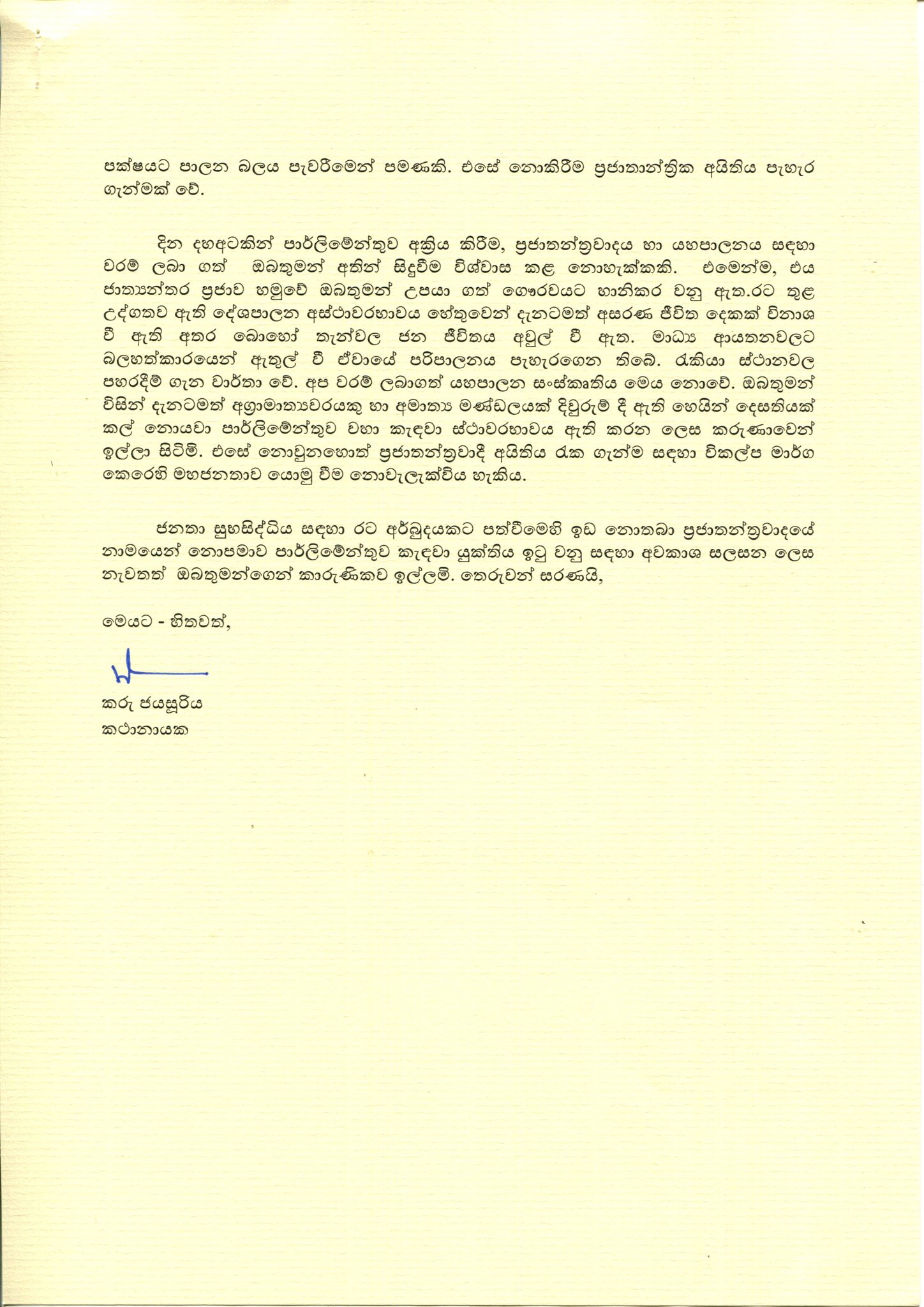 (UTV|COLOMBO) – Speaker Karu Jayasuriya has sent a letter to President Maithripala Sirisena requesting to protect the rights and privileges of the Parliamentarians.